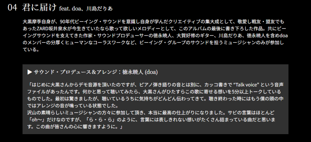 サウンド・プロデュース&アレンジの徳永暁人(doa)さんの「君に届け」のライナーノーツを紹介します。(情報ソース:maki-ohguro.com)