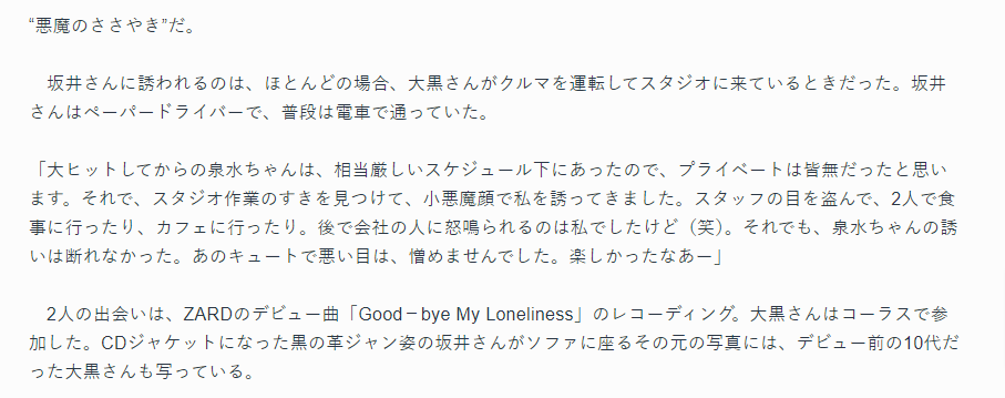 「大ヒットしてからの泉水ちゃんは、相当厳しいスケジュール下にあったので、プライベートは皆無だったと思います。それで、スタジオ作業のすきを見つけて、小悪魔顔で私を誘ってきました。スタッフの目を盗んで、2人で食事に行ったり、カフェに行ったり。後で会社の人に怒鳴られるのは私でしたけど(笑)。それでも、泉水ちゃんの誘いは断れなかった。あのキュートで悪い目は、憎めませんでした。楽しかったなあー」